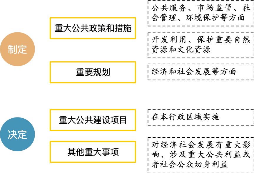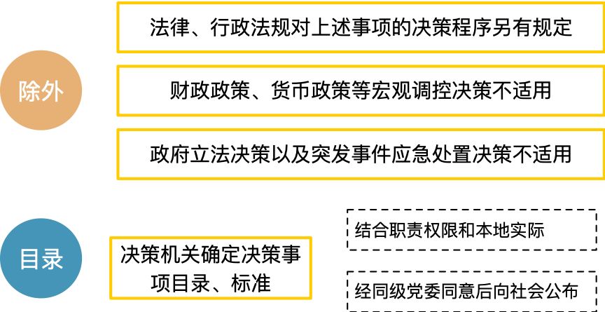 答:條例通過“列舉+排除”框定重大行政決策事項的范圍,允許決策機關結(jié)合職責權(quán)限和本地實際確定決策事項目錄、標準,經(jīng)同級黨委同意后向社會公布并根據(jù)實際變化調(diào)整。列舉的事項包括:一是制定有關公共服務、市場監(jiān)管、社會管理、環(huán)境保護等方面的重大公共政策和措施;二是制定經(jīng)濟和社會發(fā)展等方面的重要規(guī)劃;三是制定開發(fā)利用、保護重要自然資源和文化資源的重大公共政策和措施;四是決定在本行政區(qū)域?qū)嵤┑闹卮蠊步ㄔO項目;五是決定對經(jīng)濟社會發(fā)展有重大影響、涉及重大公共利益或者社會公眾切身利益的其他重大事項。同時,明確排除了3類事項,分別是財政政策、貨幣政策等宏觀調(diào)控決策,政府立法決策,突發(fā)事件應急處置決策。