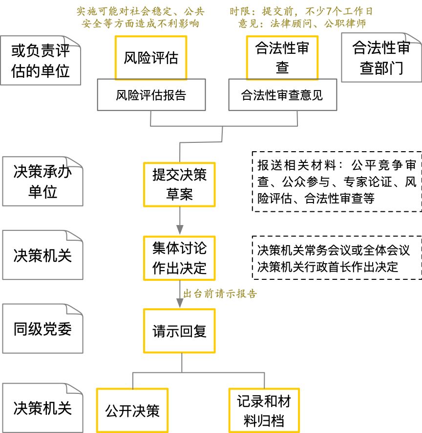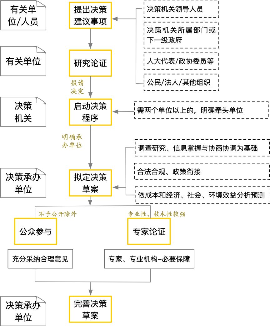 1.決策啟動。提出決策事項建議的,應當論證擬解決的主要問題、建議理由和依據(jù)、解決問題的初步方案及其必要性、可行性等。決策承辦單位應當全面梳理與決策事項有關的法律、法規(guī)、規(guī)章和政策,使決策草案合法合規(guī)、與有關政策相銜接。
