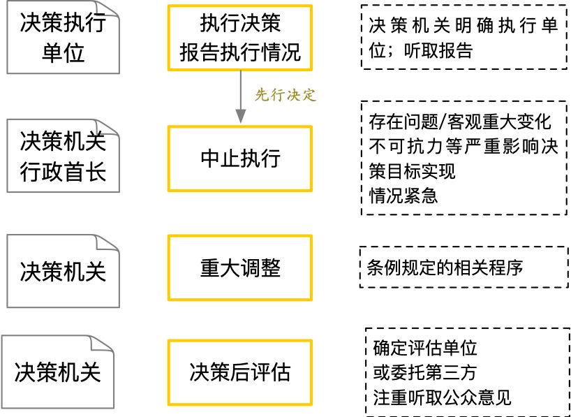 7.決策后評估。加強對行政決策執(zhí)行情況的跟蹤反饋、后評估。后評估要廣泛聽取公民、法人和其他組織的意見,運用科學的方法和技術手段收集、分析和評估相關資料,客觀全面地作出跟蹤反饋、評估。評估報告是決策繼續(xù)執(zhí)行、停止執(zhí)行、暫緩執(zhí)行或者重新調(diào)整的重要依據(jù)。行政機關要根據(jù)評估報告及時調(diào)整和完善有關決策。